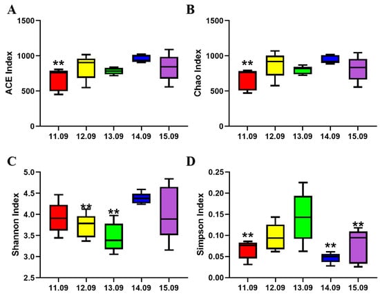 Effects of different dietary protein levels on α-diversity of cecal microbiota at the fattening stage of Ningxiang pigs. (A) Ace index, (B) Chao index, (C) Shannon index, (D) Simpson index. An individual pig was regarded as the experimental unit (n = 5). ** represent significant difference, p < 0.05.