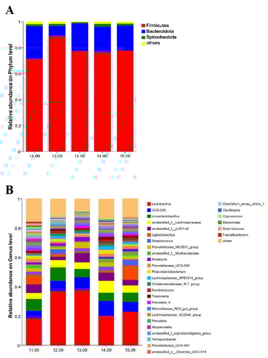 As shown in Figure 3, at the phylum level, three dominant phyla were detected in the five groups. Firmicutes, Bacteroidota, and Spirochaetota were the dominant phyla, accounting for 71.11, 25.43, and 1.35%, respectively, in the 11.09% dietary protein level group; 88.55, 8.26, and 1.52%, respectively, in the 12.09% dietary protein level group; 77.31, 21.39, and 0.39%, respectively, in the 13.09% dietary protein level group; 76.29, 19.90, and 2.06%, respectively, in the 14.09% dietary protein level group; and 77.72, 19.27, and 1.57%, respectively, in the 15.09% dietary protein level group (Figure 3A). At the genus level, a total of 31 genera were detected in the five groups. The dominant genera in the 11.09% dietary protein level group were Lactobacillus, Limosilactobacillus, Ligilactobacillus, unclassified_f__p-251-o5, and UCG-005. The proportions were 18.44, 8.11, 6.68, 5.87, and 5.08%, respectively. The dominant strains in the 12.09% dietary protein level group were Lactobacillus, Limosilactobacillus, UCG-005, unclassified_f__Lachnospiraceae, and Streptococcus. The proportions were 36.95, 9.09, 7.00, 4.99, and 3.50%, respectively. The dominant genera in the 13.09% dietary protein level group were Lactobacillus, UCG-005, Limosilactobacillus, unclassified_f__p-251-o5, and unclassified_f__Lachnospiraceae. The proportions were 37.84, 8.78, 6.22, 5.63, and 4.61%, respectively. The dominant genera in the 14.09% dietary protein level group were Lactobacillus, UCG-005, unclassified_f__Lachnospiraceae, Limosilactobacillus, and unclassified_f__p-251-o5. The proportions were 19.84, 10.35, 8.15, 5.60, and 5.57%, respectively. The dominant genera in the 15.09% dietary protein level group were Lactobacillus, Ligilactobacillus, UCG-005, Limosilactobacillus, and unclassified_f__Lachnospiraceae. The proportions were 22.86, 9.61, 6.56, 6.45, and 4.98%, respectively (Figure 3B).