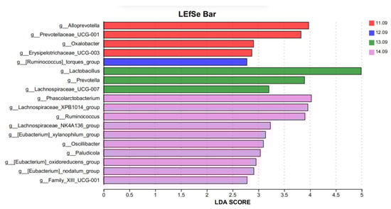 Lefse analysis was used to analyze and identify bacteria with significant differences at the genus level in different protein levels treated in five diets (Figure 4, LDA = 2.5). Lefse analysis was used to analyze and identify bacteria with significant differences at the genus level in different protein levels treated in the five diets (Figure 4, LDA = 2.5). Four species of differential bacteria (Alloprevotella, Prevotellaceae_UCG-001, oxalter, and Erysipelotrichaceae_UCG-003) were significantly enriched at the 11.09% dietary protein level group. Ruminococcus]_torques_group was significantly enriched in the 12.09% dietary protein level group and three distinct strains (Lactobacillus, Prevotella, and Lachnospiraceae_UCG-007). Ten species of bacteria (Phascolarctobacterium, Lachnospiraceae_XPB1014_group, Xylanophilum_group, Ruminococcus, Lachnospiraceae_NK4A136_group, Oscillibacter, Paludicolag, Oxidoreducens_group, Nodatum_group, and g__Family_XIII_UCG-001) were significantly enriched in the 14.09% diet protein group.