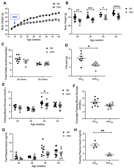 Mice administered NAC showed significantly lower body weight throughout the study (Figure 1A,B), and no difference in food intake was detected between ND and NAC mice (Figure 1C). Additionally, NAC mice showed significantly lower fat pad weight at 60 weeks (Figure 1D). Fasting blood glucose at 4 h (Figure 1E) was unchanged between groups, with the exception of the 48-week NAC cohort, and no difference was detected for overnight fasting blood glucose between ND and NAC mice at 60 weeks (Figure 1F). Fed plasma insulin levels were similar between ND and NAC mice at each timepoint (Figure 1G), but significantly lower 4 h fasting plasma insulin was determined in 60-week NAC mice compared to ND mice (Figure 1H). Fed circulating triglycerides and cholesterol showed no differences between ND and NAC mice (Supplementary Figure S3).