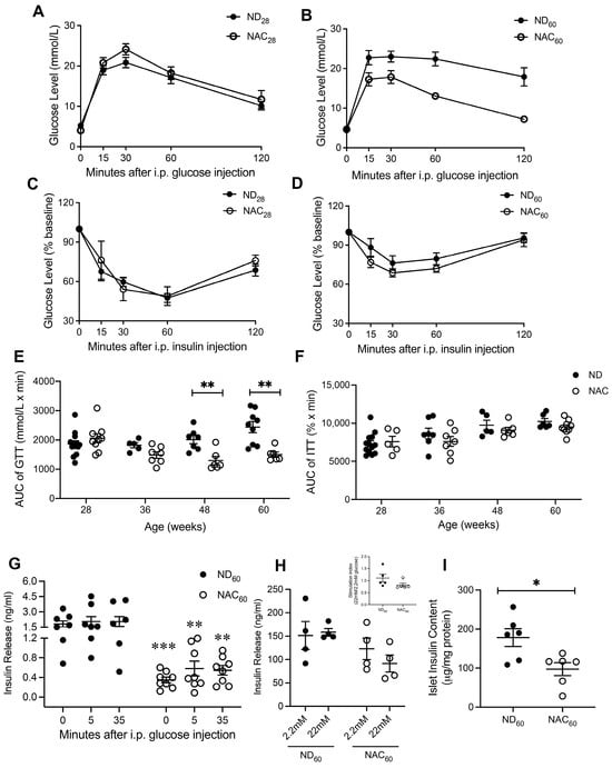 At 28 weeks, both ND and NAC mice showed a similar glucose clearance response when challenged with an IPGTT (Figure 2A). However, 60-week NAC mice normalized their glucose within 2 h, which did not occur in ND mice (Figure 2B). The GTT AUC in NAC mice was maintained throughout the duration of the study, while ND mice showed a progressive impairment at 48 and 60 weeks (Figure 2E). There were no differences in ITT AUC between ND and NAC mice during the study period (Figure 2B,F). In vivo GSIS revealed that both NAC and ND mice at 60 weeks had limited GSIS response (Figure 2G). Notably, NAC mice displayed significantly reduced insulin secretion pre- and post-glucose injection (Figure 2G). Ex vivo islet GSIS further verified that NAC and ND mouse islets showed an impaired response to GSIS (Figure 2H). The insulin content of NAC mouse islets was significantly lower when compared to ND islets at 60 weeks (Figure 2I), which was correlated with lower plasma insulin and insulin release during GSIS (Figure 1H and Figure 2G,H).