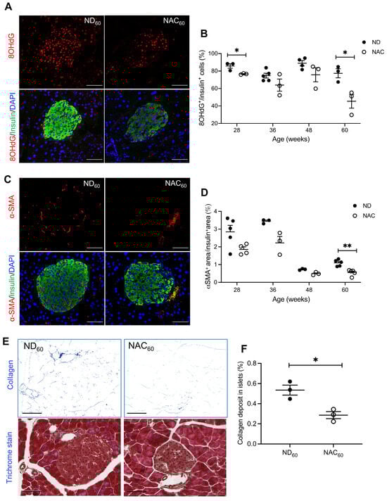 To examine NAC’s impact on beta cell oxidative stress, the presence of 8OHdG in beta cells was quantified using double staining for 8OHdG and insulin (Figure 3A). 8OHdG labeling in insulin-positive cells was significantly lower in NAC mice at 28 and 60 weeks compared to ND mice (Figure 3B). The reduction in intra-islet oxidative stress coincided with a significant decrease of intra-islet αSMA+ area in 60-week NAC mice (Figure 3C,D), suggesting that NAC lowered intra-islet PaSC activation. To evaluate whether the NAC-associated decrease in PaSC activation resulted in a decrease in islet fibrosis, quantification of islet collagen was performed using a trichrome stain (Figure 3E). Islet collagen deposition was significantly lower in NAC mice compared to ND mice (Figure 3F).