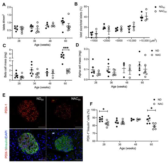 Long-term NAC supplementation preserves beta cell mass but reduces nuclear PDX-1 expression in aging mice. (A) Islet density at 28 weeks (n = 5 ND; n = 6 NAC mice/group), 36 weeks (n = 6 ND, n = 5 NAC mice/group), 48 weeks (n = 4 mice/group), and 60 weeks (n = 6 mice/group). (B) Islet size distribution at 60 weeks of age (n = 4 ND; n = 3 NAC mice/group). Islet morphometric analysis of (C) beta cell mass at 28 weeks (n = 6 ND; n = 5 NAC mice/group), 36 weeks (n = 6 ND; n = 5 NAC mice/group), 48 weeks (n = 4 ND; n = 3 NAC mice/group), and 60 weeks (n = 5 ND; n = 6 NAC mice/group). (D) Alpha cell mass at 28 weeks (n = 6 ND; n = 3 NAC mice/group), 36 weeks (n = 6 ND; n = 5 NAC mice/group), 48 weeks (n = 3 mice/group), and 60 weeks (n = 5 ND; n = 6 NAC mice/group). (E) Representative double immunofluorescence images of PDX-1 (red) co-stained with insulin (green); nuclei are stained with DAPI (blue). Scale bars: 50 µm. (F) Quantification of nuclear PDX-1 in insulin+ cells at 28 weeks (n = 6 ND; n = 5 NAC pancreata/group), 36 weeks (n = 5 pancreata/group), 48 weeks (n = 3 pancreata/group), and 60 weeks (n = 5 pancreata/group). Control diet (ND): closed circle; NAC: open circle. Data are expressed as means ± SEM. * p < 0.05, *** p < 0.001; analyzed using unpaired Student’s t-tests.