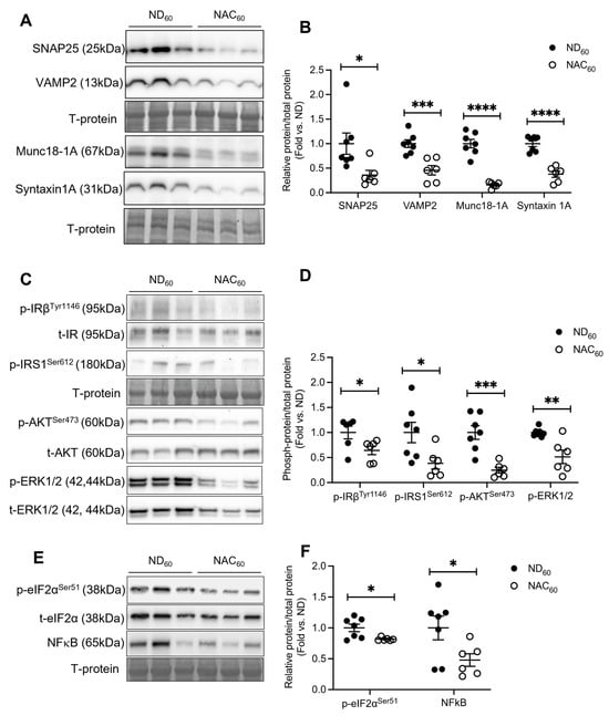 Long-term NAC supplementation reduced ROS and altered insulin exocytotic protein levels and intracellular signaling pathways. (A) Representative Western blot images and (B) densitometry quantification of SNARE proteins SNAP25, VAMP2, Munc18-1A, and syntaxin 1A in isolated mouse islets at 60 weeks (n = 7 ND; n = 6 NAC mouse-isolated islets/group). (C) Representative Western blot images and (D) densitometry quantification of phosphorylated proteins IRβTyr1146, IRS-1Ser612, AktSer473, and ERK1/2, and their total proteins (n = 7 ND; n = 6 NAC mouse-isolated islets/group). (E) Representative Western blot and (F) densitometry quantification of phosphorylated and total eIF2α and NFκB (n = 7 ND; n = 6 NAC mouse-isolated islets/group). Control diet (ND): closed circle; NAC: open circle. Data are expressed as means ± SEM. * p < 0.05, ** p < 0.01, *** p < 0.001, **** p < 0.0001; analyzed using unpaired Student’s t-tests.