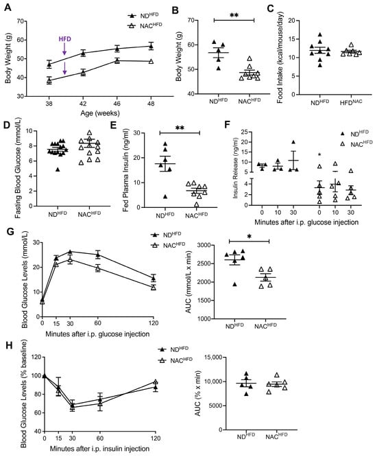 Long-term NAC supplementation preserves weight and glucose metabolism in aging mice undergoing HFD challenge. (A) Body weight trends during HFD challenge (n = 5 NDHFD; n = 8 NACHFD mice/group). Body weight (B) (n = 5 NDHFD; n = 8 NACHFD mice/group), food intake measurements (C) (n = 7 NDHFD; n = 9 NACHFD mice/group), fasting blood glucose (D) (n = 15 NDHFD; n = 12 NACHFD mice/group), and fed plasma insulin (E) (n = 6 NDHFD; n = 8 NACHFD mice/group) after 8 weeks of HFD challenge. (F) In vivo GSIS after 8 weeks HFD challenge at 48 weeks of age (n = 3 NDHFD; n = 5 NACHFD mice/group); statistics were performed using unpaired Student’s t-test within each timepoint. (G) IPGTT and AUC (n = 6 NDHFD; n = 5 NACHFD mice/group) and (H) IPITT and AUC (n = 5 NDHFD; n = 6 NACHFD mice/group) after 8 weeks of HFD challenge. HFD challenge in control diet (NDHFD): closed triangle; HFD challenge in NAC treatment group (NACHFD): open triangle. Data are expressed as means ± SEM. * p < 0.05, ** p < 0.01; analyzed using unpaired Student’s t-tests.