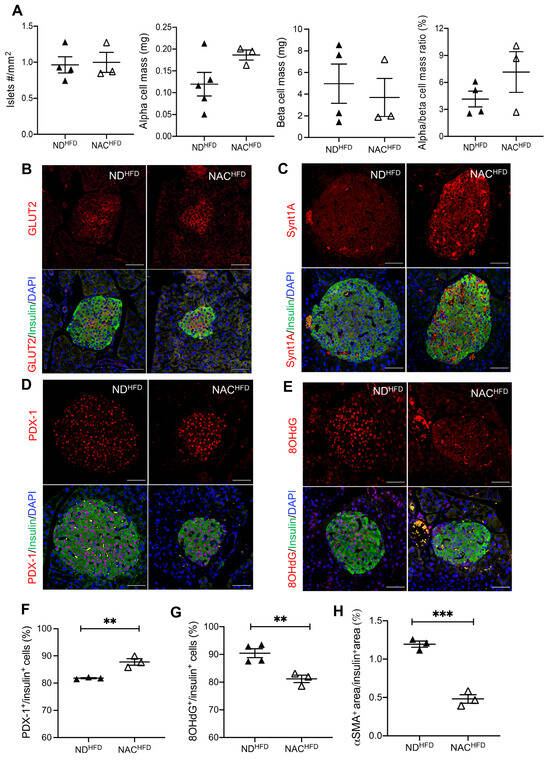 - Schuurman, M.; Wallace, M.; Sahi, G.; Barillaro, M.; Zhang, S.; Rahman, M.; Sawyez, C.; Borradaile, N.; Wang, R. N-acetyl-L-cysteine treatment reduces beta-cell oxidative stress and pancreatic stellate cell activity in a high fat diet-induced diabetic mouse model. Front. Endocrinol. 2022, 13, 938680. [Google Scholar] [CrossRef]