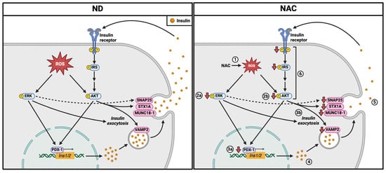 Schematic for proposed model of the effects of long-term antioxidant NAC therapy on beta cell function in aging mice. In normal diet (ND) conditions (left), physiological levels of reactive oxygen species (ROS) in beta cells promote phosphorylation of AKT and ERK signaling, which promote PDX-1 activity. PDX-1 promotes transcription of the insulin gene, resulting in insulin synthesis and secretion. ROS and insulin-linked AKT pathway enhance the expression of proteins involved in insulin exocytosis, while ROS-linked ERK pathway promotes insulin exocytosis, perhaps through phosphorylation of SNAP25. In long-term NAC treatment (right), (1) NAC reduces intracellular ROS levels, which reduces phosphorylation of (2a) ERK1/2 and (2b) AKT, which reduces (3a) nuclear translocation of PDX-1 and (3b) expression of insulin exocytotic proteins. Reduced nuclear PDX-1 results in (4) less insulin production. Lower insulin content and reduced expression of insulin exocytosis proteins (5) decrease insulin secretion. This results in (6) less autocrine insulin signaling and (2b) further reduces AKT phosphorylation. Created in BioRender.com.