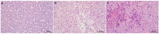 The changes in the liver tissue morphology of T. ovatus after ammonia stress. HE (×400): (a) control (CK) group; (b) 5 mg/L ammonia-N stress (A5) group; (c) 10 mg/L ammonia-N stress (A10) group.