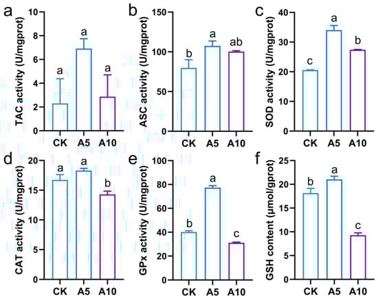 The changes in the biochemical indexes related to oxidative stress in the liver of T. ovatus after ammonia stress. (a) total antioxidant capacity (TAC) activity; (b) anti-superoxide anion generation capacity (ASC) activity; (c) total superoxide dismutase (SOD) activity; (d) catalase (CAT) activity; (e) glutathione peroxidase (GPx) activity; (f) glutathione (GSH) content. The lowercase letters on the bar indicate significant differences (p < 0.05). CK, control group; A5, 5 mg/L ammonia-N stress group; A10, 10 mg/L ammonia-N stress group.