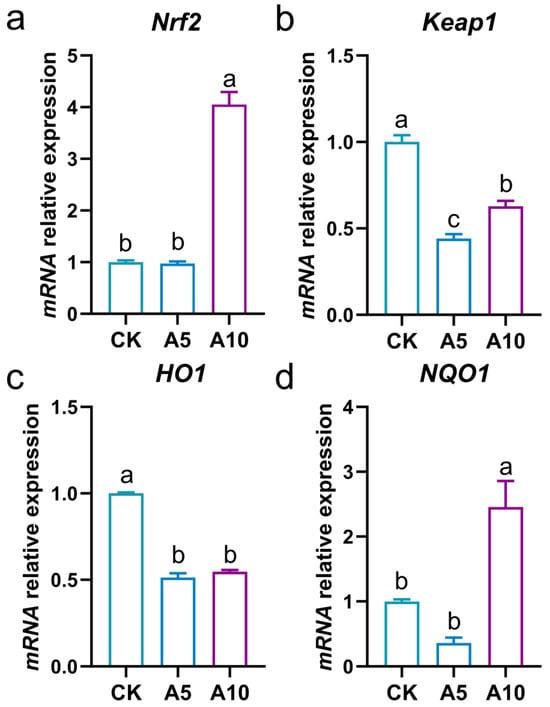 The antioxidant signaling genes expression in the liver was explored (Figure 3). Compared with the CK group, the relative mRNA expression levels of the nuclear factor erythroid 2-related factor 2 (Nrf2) and NAD(P)H quinone oxidoreductase 1 (NQO1) genes showed no significant changes in the A5 group (p > 0.05), but were significantly increased in the A10 group (p < 0.05). The expressions of the kelch-like ECH-associated protein 1 (Keap1) and heme oxygenase-1 (HO1) genes were significantly decreased in the A5 and A10 groups (p < 0.05).
