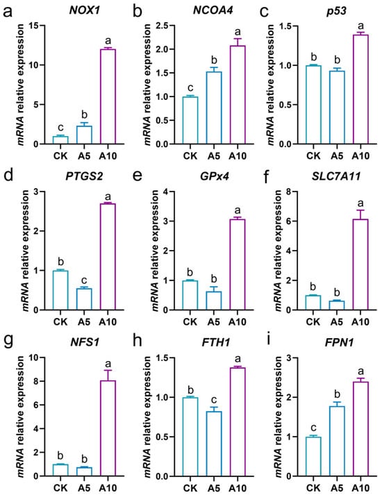 The changes in the mRNA relative expression levels of the ferroptosis related genes in the liver of T. ovatus after ammonia stress. (a) NOX1 gene expression; (b) NCOA4 gene expression; (c) p53 gene expression; (d) PTGS2 gene expression; (e) GPx4 gene expression; (f) SLC7A11 gene expression; (g) NFS1 gene expression; (h) FTH1 gene expression; (i) FPN1 gene expression. The lowercase letters on the bar indicate significant differences (p < 0.05). CK, control group; A5, 5 mg/L ammonia-N stress group; A10, 10 mg/L ammonia-N stress group.