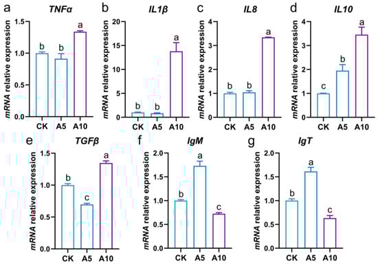 The immune response of the liver was evaluated (Figure 5f,g). Compared with the CK group, the relative mRNA expression levels of the IgM and immunoglobulin T (IgT) were significantly increased in the A5 group, but significantly decreased in the A10 group (p < 0.05).