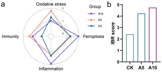 The effects of ammonia stress on different physiological functions of the liver are shown in the IBR star plots (Figure 6a). Among them, the oxidative stress index was more affected in the A5 group, while ferroptosis and inflammation were more affected in the A10 group. Additionally, immune indexes were affected to varying degrees in the A5 and A10 groups. The IBR score showed that with the increase of ammonia concentration, the degree of hepatotoxicity was increased (Figure 6b).