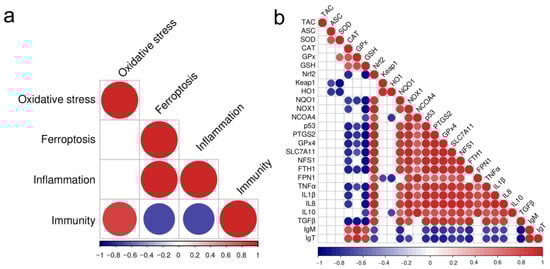 The correlation analysis of the changes of physiological indexes in the liver of T. ovatus after ammonia stress. (a) The correlation between the different physiological functions; (b) The correlation between the different physiological indexes. The color of the circle represents correlation: the red is positive correlation and the blue is negative correlation.