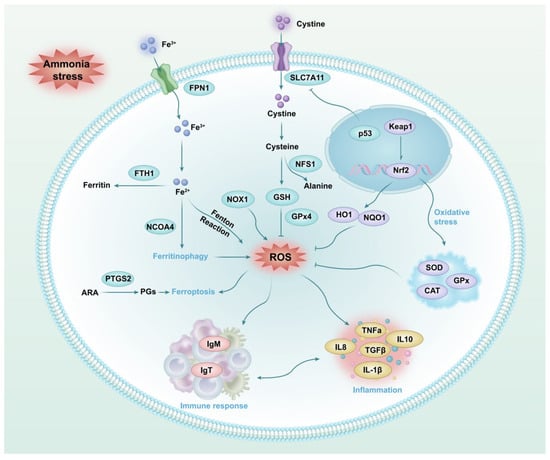 This study revealed the toxic effect of ammonia stress on the physiological homeostasis of the liver of T. ovatus. Specifically, ammonia stress caused histomorphological changes in the liver, induced oxidative stress, and interfered with antioxidant function through Nfr2/HO1/NQO1 signaling and antioxidant enzymes. Furthermore, ammonia stress also influenced ferroptosis homeostasis in the liver by affecting GSH synthesis, iron transport, and ferritin synthesis. Ferritinophagy related gene expressions induced inflammatory response by affecting the expression of interleukin, TNFα, and TGFβ genes and caused immune dysfunction by interfering with IgM and IgT gene expression (Figure 8). These findings provide critical insights into the physiological mechanisms of ammonia-induced hepatotoxicity in T. ovatus and also facilitate the development of anti-stress strategies.