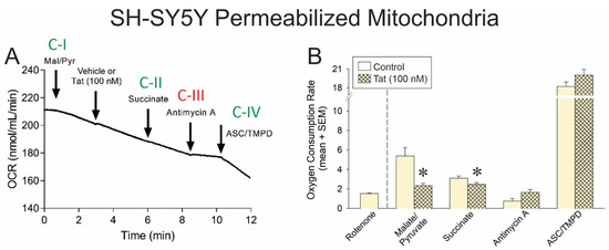 (A) Oxygen consumption rate (OCR) of permeabilized SH-SY5Y human neuroblastoma cells (n = 3–11 independent cultures/group) was assessed via a Clark-type electrode (representative oxygraph shown). Cells were sequentially exposed to pharmacological activators of complex I (malate and pyruvate), an activator of complex II (succinate), an inhibitor of complex III (antimycin A), activators of complex IV (ascorbate and TMPD), and a complex I inhibitor (rotenone). Downward arrow indicates onset of reagent effect. (B) The OCR of control cells was compared to that of cells pretreated with HIV Tat (100 nM) within each pharmacological condition (* indicates significant difference from respective control; two-tailed Student’s t-test, p < 0.05). Arrows indicates addition of reagent.