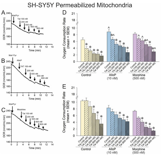 Human SH-SY5Y neuroblastoma cells (obtained from ATCC, #CRL-2266; Manassas, VA, USA) were seeded onto a T-225 flask at a density of 5 × 106 cells/flask. Cells were maintained in growth medium: 89.5% DMEM/F12 (Life Technologies, Carlsbad, CA, USA), 10% heat-inactivated fetal bovine serum (FBS; Thermo Scientific Hyclone, Logan, UT, USA), and 0.5% antibiotic/antimycotic mixture (Life Technologies, Carlsbad, CA, USA). The OCR in human SH-SY5Y neuroblastoma cells was determined via an Oxytherm Clarke-type electrode system (Hansatech, Germany, distributed by PP System, MA, USA) and was used to assess the effects of HIV-1 Tat1–86, AlloP, and/or morphine. SH-SY5Y cells were trypsinized and centrifugated at 180× g for 5 min at room temperature, and the pellet was washed once with DPBS. The final cell pellet was re-suspended in DPBS to a concentration of 200 × 106 cells/mL. Studies were performed on mitochondria with the plasma membrane permeabilized by digitonin (final concentration of 5 μm). A volume of 100 μL of the cell suspension (20 × 106 cells/run) was added to the chamber of the Oxytherm Clark-type electrode system containing 0.9 mL of mitochondria buffer (20 mM HEPES, pH 7.3, 120 mM KCl, 2 mM KH2PO4, 2 mM MgCl2, 1 mM EGTA) which was equilibrated at 37 °C. Once baseline respiration was established, the compounds were injected into the chamber at 3-min intervals using a Hamilton syringe. The mitochondria buffer was supplemented with 5 mM sodium pyruvate and sodium malate (Sigma-Aldrich, Saint Louis, MO, USA) to energize complex I, 5 mM sodium succinate dibasic hexahydrate (Sigma-Aldrich, Saint Louis, MO, USA) to energize complex II, and 5 mM l-ascorbic acid plus 0.2 mM N, N, N′, N′-tetramethyl-p-phenylenediamine for complex IV (See Supplemental Figure S1A–C). The use of these substrates was necessary to provide electrons to different sites within the mitochondrial ETC. The integrity of mitochondria was evaluated by using known complex I and III inhibitors, rotenone (Sigma, Saint Louis, MO, USA) and antimycin A (Sigma, Saint Louis, MO, USA), respectively (Supplemental Figure S1A,B). The inhibitors were added at a final concentration of 1 μm. The final concentration of solvent used was less than 0.1% (v/v). Neither Tat (Supplemental Figure S1C), morphine (Supplemental Figure S1E), nor AlloP (Supplemental Figure S1F) prevented mitochondrial respiration from responding to complex activators or inhibitors.