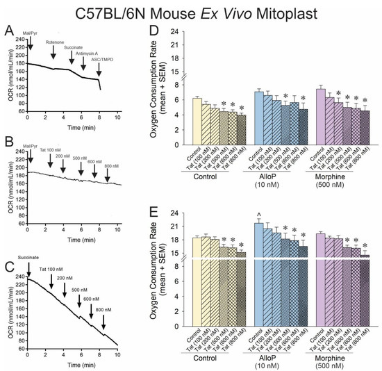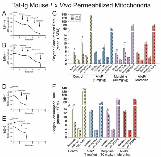 Mitochondria were derived from C57BL/6NHSd mice or from Tat-tg mice that carried the tat transgene [Tat(+)] or did not carry the transgene [Tat(−)] (n = 2 brains per experimental replicate). Mitochondria from mouse brains were isolated using the high-yield, differential centrifugation procedure (Bio-Protocol LLC, Sunnyvale, CA, USA; https://bio-protocol.org, accessed 1 February 2021). Mice were fasted for 16 h overnight (i.e., the last 4 h of their dark cycle and all 12 h of their light cycle). Mice were sacrificed by cervical dislocation. When Tat(−) or Tat(+) mice were used, the mice were first treated with AlloP (1 mg/kg, s.c., QD) for 7 days while tat expression was contemporaneously induced via doxycycline (30 mg/kg, i.p., QD for 5 days, followed by 2 days of washout [56,57]; with or without morphine (30 mg/kg, i.p.) administered 60 min prior to tissue collection and mitochondria preparation on day 8. It is notable that chronic exposure to doxycycline can injure mitochondria, but the current dosing was low, and the exposure was very acute. All mitochondrial preparations demonstrated the expected yields and respiratory capacity as described. Mouse brains were isolated and placed in cold extraction buffer (1.25 mM Sucrose, 250 mM mannitol, 10 mM HEPES, and 10 mM EGTA) supplemented with freshly added 0.01% BSA (Sigma, MO) and 1× protease inhibitor (Fisher Scientific, IL). After mincing and homogenizing the brain(s) with a Dounce homogenizer (grind the brain 20 times) on ice, the homogenate was centrifugated at 700× g for 10 min at 4 °C. The supernatant was re-centrifugated at the same speed for an additional 10 min at 4 °C. The supernatant of the second centrifugation was centrifugated at 10,000× g for 15 min at 4 °C. The pellet was re-suspended in small volume, and protein was measured at 280 nm using a NanoDrop 2000c Spectrophotometer (Thermo Scientific, Waltham, MA, USA). Stock suspension(s) containing 3 mg of proteins/mL were stored on ice in an extraction buffer without BSA and protease inhibitor. The yield for mitochondria averaged 3.95 mg/mL for every two brains (SEM = 0.04). Mitochondria (230 μg) were assessed for respiration as described above.