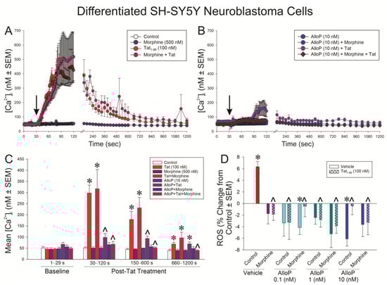 The functional effects for Tat to dysregulate [Ca2+]i (Figure 5A–C) and to promote ROS formation (Figure 5D) were assessed in differentiated SH-SY5Y cells. The application of Tat precipitated a rapid influx of [Ca2+]i that could be ameliorated by AlloP but not morphine (Figure 5A,B). A time-binned analysis demonstrated that treatment groups did not significantly differ prior to the administration of Tat (see arrow Figure 5A,B); however, Tat significantly increased [Ca2+]i compared to control at all following time points, irrespective of morphine co-exposure (p < 0.05; Figure 5C; see *). Pretreatment with AlloP (10 nM) significantly attenuated the Tat-induced increase in [Ca2+]i during the greatest Tat-promoted rises, which occurred between 30 and 600 s, irrespective of whether AlloP was co-administered with morphine (p < 0.05; Figure 5C; see ^). After Tat-induced [Ca2+]i had fallen (660–1200 s), only the AlloP + morphine-treated cells remained significantly different from Tat or Tat + morphine treatment (p < 0.05; Figure 5C; see ^). Notably, even among AlloP-pretreated cells, there was a modest but apparent increase in [Ca2+]i caused by Tat. However, this did not reach statistical significance until the last binned time point (660–1200 s; p = 0.05; Figure 5C; see *). Groups treated with AlloP + Tat did not differ from those treated with AlloP + Tat + morphine at any time point (Figure 5C).