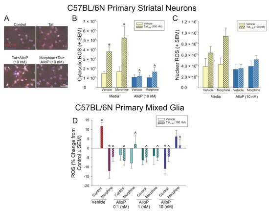 Tat’s effects to promote ROS were further characterized in isolated, primary C57BL/6N striatal neurons (Figure 6A–C) and primary C57BL/6N mixed glia (Figure 6D). CellROX was used to differentiate the contributions of cytosolic vs. nuclear ROS in primary striatal mouse neurons (Figure 6A). Tat significantly induced cytosolic ROS with or without morphine present (Figure 6B; yellow bars; see *); however, nuclear ROS only tended to be significantly increased when Tat was administered (Figure 6C; yellow bars; p = 0.05). Irrespective of morphine, AlloP (10 nM) significantly attenuated cytosolic ROS (Figure 5B; blue bars; see ^). It is notable that morphine was not found to decrease cytosolic or nuclear ROS on its own, in contrast to what was seen in differentiated SH-SY5Y cells when ROS was detected with H2DCFDA (Figure 5D). However, this effect in SH-SY5Y cells was very small, and CellROX is known to express weak fluorescent signal, even in its reduced state, which may have limited its sensitivity in the present comparative analysis.