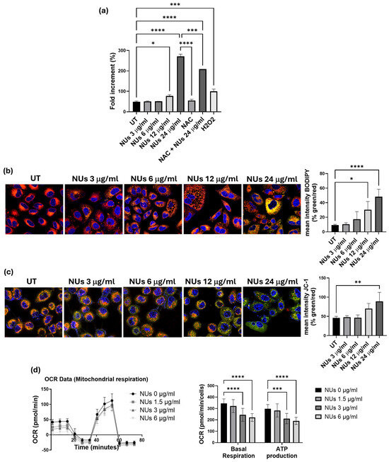 Since mitochondria are central to ROS production [29], we investigated mitochondrial dysfunction using the JC-1 assay, an indicator of mitochondrial membrane potential (MMP). As shown in Figure 3c, after a brief exposure (3 h) to 24 μg/mL NUs, cells exhibited a marked shift in emission from red to green, reflecting MMP depolarization and decreased mitochondrial activity and integrity. Furthermore, considering the strong link between mitochondrial functionality and ATP production [30], we evaluated whether the early decrease in MMP observed after 3 h of NUs treatment could result in sustained mitochondrial dysfunction over longer exposure times. Using the Seahorse XF Mito Stress Test Kit, we found significant reductions in both basal respiration and ATP production after 72 h of treatment with 3 and 6 μg/mL NUs (Figure 3d). These findings suggest that NUs disrupt mitochondrial function, contributing to impaired energy metabolism and cell death.