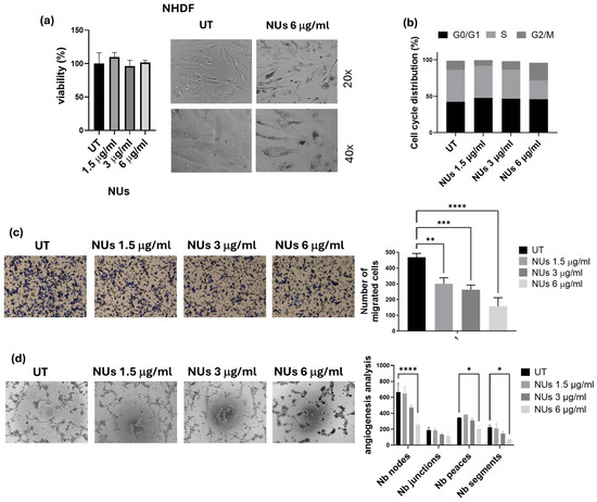 (a) MTT assay of NHDF cells treated with different doses of NUs for 72 h on the left and relative pictures obtained with an inverted microscope at 20× magnification after 6 μg/mL of NUs for 72 h on the right. (b) Cell cycle distribution analyzed by FACS after 24 h of treatment on A549 cells. (c) Representative images of invasiveness of A549 cells treated with different concentrations of NUs for 72 h (on the left) and quantitative analysis of the number of migrated cells through Geltrex on the right). One-way ANOVA, GraphPad Prism. ** p < 0.005, *** p < 0.0005, **** p < 0.0001. (d) Representative pictures (on the left) and relative quantification chart of capillary morphogenesis assay (on the right) of A549 treated with different concentrations of NUs for 72 h. Two-way ANOVA, GraphPad Prism. * p < 0.05, *** p < 0.005, **** p < 0.0001.