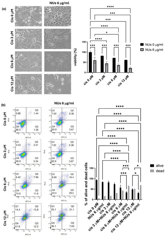 (a) MTT assay of A549 cells treated with different doses of cisplatin and NUs for 72 h. One-way analysis of variance (ANOVA), GraphPad Prism. * p < 0.05, *** p < 0.0005, **** p < 0.0001. (b) Cellular apoptosis of A549 cells after the treatment with different doses of cisplatin alone or in combination with NUs 6 μg/mL analyzed by FACS through cellular incorporation of PI and Annexin V-APC; a representative flow cytometry dot-plot picture on the left and relative quantification on the right. Two-way analysis of variance (ANOVA), GraphPad Prism * p < 0.05, *** p = 0.0001, **** p < 0.0001.