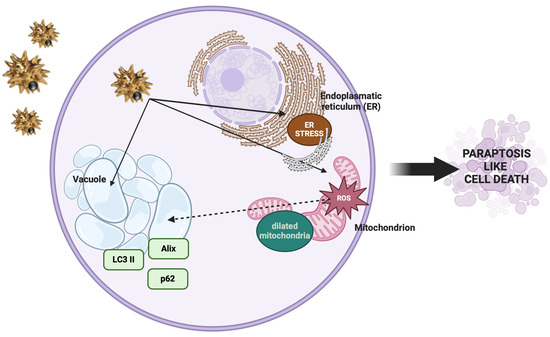 In the present study, we investigated the anticancer potential of gold–iron oxide (Au-Fe3O4) NUs. Our findings demonstrate that NUs treatment induced significant cytotoxicity in melanoma (A375) and pancreatic (MIA PaCa-2) cancer cells, with MCF7 breast cancer cells also exhibiting considerable toxicity. In contrast, A549 lung cancer cells displayed a higher resistance to NUs treatment, though a substantial reduction in cell viability and cell death were observed at higher concentrations (24 μg/mL) after 72 h. These results highlight the varying sensitivity of cancer cell lines to NU treatment, suggesting that the response to the proposed NUs may be influenced by cell-specific factors such as membrane integrity, antioxidant capacity, and stress response pathways. Indeed, the higher resistance of A549 cells to NUs treatment appears to be primarily attributed to their elevated expression levels of antioxidant genes compared to the other tested cell lines, as shown in the Supplementary Materials (Supplementary Figure S1 and Table S1). This observation aligns with the existing literature, where A549 cells have been reported to produce fewer reactive oxygen species (ROS) than other cell lines, such as those from breast cancer or melanoma when treated with nanoparticles [35,36,37]. This reduced ROS production may contribute to the enhanced resistance of A549 cells to oxidative stress-induced cytotoxicity. One of the notable observations in MCF7 and more pronounced in A549 cells was the formation of cytoplasmic vacuoles following NUs treatment at sub-lethal doses. These vacuoles, which could be mistaken for lipid droplets, were negative for Oil Red O staining, indicating that they were not lipidic in nature. Instead, the vacuolization is consistent with cellular responses to stress and suggests that NU treatment may trigger a non-apoptotic form of programmed cell death. Indeed, the vacuoles observed in A549 cells bear characteristics of paraptosis, a caspase-independent form of cell death that is marked by the extensive dilation of the endoplasmic reticulum (ER) and mitochondria [38,39,40]. Oxidative stress is a key mediator of nanoparticle-induced cytotoxicity, particularly in cancer cells, where redox homeostasis is frequently altered. While tumor progression is often supported by elevated reactive oxygen species (ROS) production, cancer cells typically upregulate antioxidant defenses to maintain ROS levels within survivable limits [41]. The ability of metallic NPs to generate ROS is a promising strategy for bypassing this protective mechanism. In our study, treatment with NUs at concentrations of 12 and 24 μg/mL significantly increased ROS production and lipid peroxidation in A549 cells, leading to mitochondrial damage and eventual cell death after prolonged exposure. ROS generation is closely linked to mitochondrial dysfunction, which we confirmed by observing early depolarization of the mitochondrial membrane potential (MMP). This MMP depolarization, a hallmark of mitochondrial damage, was associated with a marked decrease in ATP production, as evidenced by Seahorse mitochondrial stress assays (Figure 3d). The sustained oxidative stress and mitochondrial dysfunction observed in A549 cells ultimately resulted in paraptosis, as characterized by cytoplasmic vacuolation and the absence of typical apoptotic markers such as membrane blebbing, chromatin condensation, or nuclear fragmentation [38,39,40]. Furthermore, we observed a significant reduction in the levels of Alix, a known endogenous inhibitor of paraptosis, following NUs treatment (Figure 4a), supporting the hypothesis that NUs-induced paraptosis is a key mechanism of cell death in A549 cells. This finding aligns with previous studies suggesting that ROS-induced paraptosis can be triggered by nanoparticles, with a growing body of evidence supporting the role of ROS generation in the initiation of this non-apoptotic death pathway [42,43,44]. Interestingly, the interplay between autophagy and paraptosis has been increasingly recognized as a critical factor in nanoparticle-induced cell death. Autophagy is a degradative process that can promote cell survival under stress conditions by recycling damaged cellular components, but when dysregulated, it can contribute to cell death [45,46]. In our study, we found that NUs treatment led to increased levels of LC3, a key marker of autophagy, and decreased levels of p62, suggesting that NUs promote autophagic flux (Figure 4a). The presence of autophagic vacuoles further supported this observation, indicating that the enhanced autophagic process was a precursor to paraptotic cell death. These findings highlight the complex relationship between autophagy and paraptosis in the context of nanoparticle-induced toxicity and suggest that targeting both pathways may enhance the therapeutic efficacy of NUs (Figure 7)
