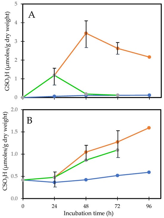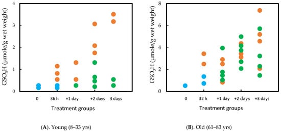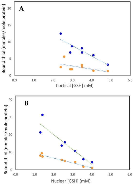 The increase in mixed disulfides observed with age continues with the further decrease in GSH in cataracts. Figure 2 shows the relationship for all lenses examined [13,39]. Mixed disulfide levels in the cataractous cortex (Figure 2A; red symbols) appear to increase in the same way, relative to [GSH], as in normal lenses (blue symbols), reaching a maximum of around 35 mmoles/mole in the Type IV lens. The levels are much more variable in the nucleus (Figure 2B), probably reflecting the use of data from a variety of different and mixed cataracts, with and without nuclear color. As can be seen in Table 1, protein-bound thiols increase with nuclear lens color (Type II–IV). In the Type IV cataractous lens, nucleus PSSG reaches around 60 mmoles/mole, but the combined PSSG + PSSC + PSSGC can reach nearly 100 mmoles/mole [39,42].