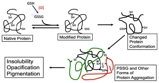 It has been proposed that the PSSG increase is the trigger for cataract development [20]. Conformational changes due to PSSG formation are proposed to lead to disulfide-linked proteins (PSSP) and then to protein–protein aggregation with eventual cataract formation. This is discussed in the next part of this review. In support of this proposal, it was shown that PSSG formation can induce conformational changes in isolated bovine lens proteins [55,56]. However, because of the nature of these studies, protein–protein disulfide links, insolubilization, and color development, typical of nuclear cataracts, could not be observed.