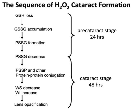 In order to understand the role of protein–thiol mixed disulfide formation in relation to the sequence of events during cataract induction, Lou and associates [50,74] conducted H2O2 exposure studies using rat lenses for 24, 48, 72, and 96 h to monitor the dynamic changes in morphology and biochemistry. During the first 24 h of exposure, only a patchy opacity was found in the equator. By 48 h, there was a full cortical opacity with lens weight gain, likely due to damage in the membrane pumps. Beyond 72 h, the opacity covered the entire lens. GSH loss and PSSG increase occurred within 2 h and continued so with prolonged H2O2 exposure. Protein thiolation was first found in the water-soluble proteins (WS), 24 h ahead of the water-insoluble proteins (WI). The formation of PSSC was much slower than that of PSSG, at least 24 h or longer in both the WS and WI fractions. This chronic oxidative stress model also revealed a profound change in the protein profile. Protein–protein disulfide (PSSP) aggregates appeared along with an increased WI-to-WS ratio after 48 h (Figure 4), well correlated with the morphological alteration [50].