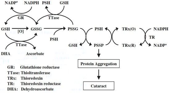It has been known and accepted for well over a century that oxidative stress, which damages DNA, proteins, and membranes in the lens, plays a role in the development of senile nuclear cataracts [16,17,18]. However, uncovering the mechanism involved has been a slow process, and even today, the sequence of events has not been identified. One of the major changes observed is the increasing loss of protein thiols with increasing lens color [13]. This is due to the formation of protein–protein disulfides (PSSP) and mixed disulfides (PSSX) between proteins and small thiol molecules, predominantly glutathione (GSH), the major antioxidant in the lens. As will be discussed in this review, the formation of mixed disulfides can probably be attributed to the failure of the antioxidant and dethiolating mechanisms.