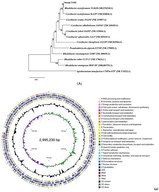 The phylogenetic tree constructed by using 16S rRNA gene sequences is presented in Figure 1A. Homologous sequence comparison was performed using the blastn tool (https://blast.ncbi.nlm.nih.gov/Blast.cgi) (accessed on 31 May 2024) in the NCBI database. The analysis revealed that the 16S rRNA gene of YS02 had a 100% sequence similarity with C. azotoformans KA25 and 98% similarity with R. azotoformans YLK20. Additionally, ANI values are used to measure overall similarity between genome sequences. According to the whole genome sequence of YS02, 12 representative strains were selected from the NCBI database and reference database GenomesDB. Phylogenetic analysis and classified identification of YS02 were further carried out by calculating the ANIb values (Table S1). The results disclosed that strain YS02 had 98.4% (highest) similarity with the C. azotoformans KA25 and 98.18% (second highest) similarity with C. azotoformans YLK20 (Table S1). Additionally, a 95–96% cut-off was proposed for species demarcation ANI. Phylogenetic systematics of new genome scale data classified Rhodobacter as a sister group to Cereibacter, making R. azotoformans synonymous and interchangeable with C. azotoformans [30,31]. Since the ANI value is higher than 96%, the isolated strain was ultimately designated as C. azotoformans-YS02.