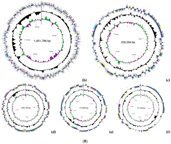 The general features of the YS02 genome are summarized in Table 1. Following quality control, the total number of bases was 1217,884,848 base pairs (bp), with a Q30 base percentage exceeding 94.98%. The length of the largest reads was 24,752 bp, and the reads’ N50 was 9417 bp. The clean data after quality control underwent de novo assembly to obtain the genome sequence. Then, gene prediction was performed on the assembled sequence. A complete chromosome and five plasmids were obtained through the assembly process. The CGView genome map of YS02 can be seen in Figure 1B. The genome of YS02 spans 4,683,739 bp with a GC content of 68.02%. It comprises a 2,995,230 bp chromosome and five plasmids: plasmid A (1,051,786 bp), plasmid B (236,356 bp), plasmid C (209,190 bp), plasmid D (113,993 bp), and plasmid E (77,184 bp). The plasmid classification was based on structural features and a lack of essential housekeeping genes. A total of 4432 protein coding genes were predicted with sequence lengths of 4,071,321 bp, giving a coding intensity of 86.92%. The prediction results revealed 12 rRNA genes, 55 tRNA genes, and 33 sRNA in the genome.