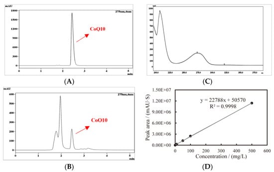 Typical HPLC chromatogram and ultraviolet spectrogram of CoQ10 acquired at 275 nm and the constructed standard curve, (A) CoQ10 standard, (B) CoQ10 in sample, (C) comparison spectrogram of standard and sample, and (D) standard curve of CoQ10.