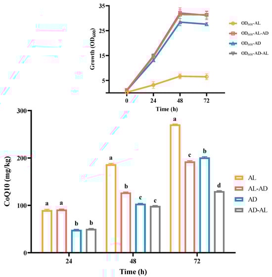 The concentration of CoQ10 in C. azotoformans-YS02 and the growth of YS02 cells under four different culture modes (n = 6). Data in the figure are the mean ± SD. Different lowercase letters denote significance (p < 0.05). Notes: AL: anaerobic–light; AD: aerobic–dark. AL-AD: 24 h of AL followed by 48 h of AD; AD-AL: 24 h of AD followed by 48 h of AL.