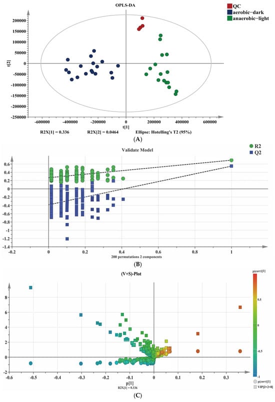 Metabolites are the end-products or intermediates of metabolic processes that have the role of modulating the phenotype of biological systems [34]. For the sake of delving deeper into the reason for the metabolic difference of YS02 under both anaerobic–light and aerobic–dark culture conditions, we applied an untargeted metabolism approach to screen for compounds and analyze the differential small molecular metabolites in YS02. To compare the profile of small molecule metabolites from YS02 under anaerobic–light and aerobic–dark cultivation, we obtained MS data using UPLC-Q-Exactive Orbitrap MS. Among these samples, 542 molecular features were obtained after the pre-processing of raw data and sufficient separation of anaerobic–light and aerobic–dark samples was achieved in the OPLS-DA results (Figure 5A), indicating a clear difference in their metabolic profiles. The CV-ANOVA verification (Table S3) manifested in the OPLS-DA model had statistical significance (p < 0.05). To verify the predictability of the OPLS-DA model, 200 permutations were conducted (Figure 5B). The results show that the original R2 and Q2 (the two rightmost points) are both larger than the corresponding value after permutation (the left scatter points), and the intercept of R2 does not exceed 0.3 (0.27), and the intercept of Q2 does not exceed 0.05 (−0.383). This suggests that there is no overfitting for the experiment; the OPLS-DA model is reliable and can be effectively utilized for further analysis.