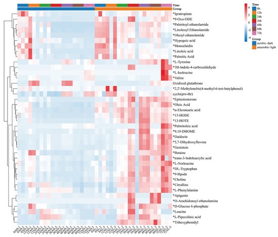 Heatmap of identified differential compounds in YS02 samples. The color scale represents the scaled abundance of each compound with red indicating higher abundance and blue indicating lower abundance (p < 0.05). The 38 significantly up-regulated compounds (VIP score > 1 and FC > 1.5) are indicated by asterisks (*); the 2 significantly down-regulated compounds (VIP score > 1 and FC < 0.67) are without asterisks. Notes: AL: anaerobic–light; AD: aerobic–dark.