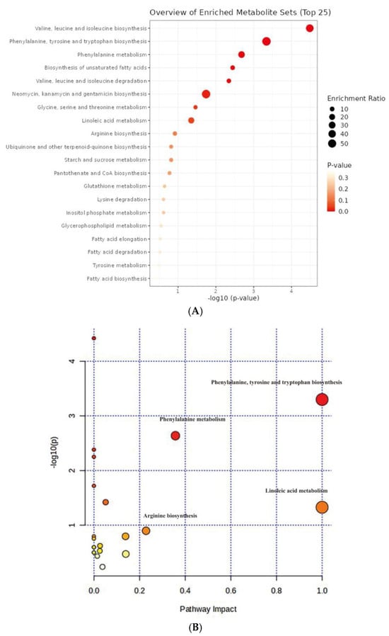 The top 25 significantly enriched metabolic pathways are displayed in Figure 7A. All of the 20 metabolic pathways show certain significance, and the enrichment ratio ranges from 0 to 1. According to the comprehensive assessment of the size and color of the dots, we discovered that valine, leucine, and isoleucine biosynthesis (leucine, isoleucine, and L-valine) and phenylalanine, tyrosine, and tryptophan biosynthesis (phenylalanine and L-tyrosine) are the top two signal pathways in terms of enrichment degree, with a smaller p-value and a larger enrichment ratio (Figure 7A). Pathway analysis referencing the KEGG pathway database revealed that there were significant differences in 4 out of 21 metabolic pathways in YS02 under different culture modes (Figure 7B), primarily including phenylalanine, tyrosine, and tryptophan biosynthesis, phenylalanine metabolism (phenylalanine and L-tyrosine), linoleic acid metabolism (linoleic acid), and arginine biosynthesis (citrulline) (pathway impact > 0.2). Within this, phenylalanine, tyrosine, and tryptophan biosynthesis ranked first in terms of significance and pathway influence (p = 0.000503, −log10(p) = 3.30, and impact = 1.0), suggesting that this pathway plays an important part in the regulation of the overall metabolic network. Despite the relatively low degree of influence and significance of the other pathways depicted in Figure 7B, they still hint at potential functions in specific biological processes.