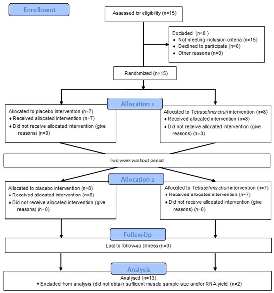 The data presented in the manuscript are from two separate sets of experiments, which recruited two independent groups of human participants. In the study reporting the effects of SOD-rich T. chuii supplementation on skeletal muscle gene expression, 15 healthy male participants were recruited, with 13 [mean ± SD (range); age, 22 ± 3 (19–28) years; height, 1.78 ± 0.06 (1.67–1.92) m; body mass, 80 ± 9 (68–96) kg; and BMI, 25 ± 2 (22–29) kg·m2] completing the study (Figure 1). This trial was registered with ClinicalTrials.gov ID: NCT06822556. A power calculation was completed using GPower (version 3) using the data of Toro et al. [19]. Based on the increase in reported after T. chuii supplementation compared to baseline and assuming a moderate correlation of 0.5 between groups, an effect size of 0.86 was anticipated. With an α of 0.05 and a power of 0.8, a sample size of 13 participants was required, with 15 participants recruited to account for participant withdrawals. In the study reporting the effects of SOD-rich T. chuii supplementation on exercise tolerance and physiological responses, 15 healthy male participants were also recruited, with 13 [mean ± SD (range); age, 24 ± 4 (19–34) years; height, 1.81 ± 0.08 (1.69–1.91) m; body mass, 82 ± 9 (69–99) kg; BMI, 25 ± 3 (22–32) kg·m2; and , 48 ± 5 (42–59) mL·kg−1·min−1], completing the study (Figure 2). This trial was registered with ClinicalTrials.gov ID: NCT06831656. A power calculation was completed using GPower (Version 3) using the data of Ramírez et al. [12]. Based on the increase in antioxidant gene expression or enzyme activities reported after T. chuii administration compared to baseline and assuming a moderate correlation of 0.5 between groups, an effect size of ≥0.9 was anticipated. With an α of 0.05 and a power of 0.8, a sample size of 12 participants was required, with 15 participants recruited to account for participant withdrawals. All participants were recreationally active, but not highly trained, non-smokers, and were instructed to avoid the consumption of dietary supplements, including antioxidants, and anti-inflammatory medications, including paracetamol and NSAIDs, for the duration of the study. Ethical approval was granted for each set of experiments by Loughborough University Ethics Approvals Committee (Human Participants Sub-Committee) with ethical approval codes of R19-P160 in the study reporting the effects of SOD-rich T. chuii supplementation on skeletal muscle gene expression and 2022-6116-8576 in the study reporting the effects of SOD-rich T. chuii supplementation on exercise tolerance and physiological responses. Before data collection commenced, each participant received a detailed explanation of the experimental procedures, the associated risks, and the potential benefits, and any questions were addressed. Written informed consent was then obtained from all participants prior to commencing data collection. Prior to all laboratory testing sessions, participants were instructed to arrive at the laboratory in a rested and fully hydrated state, having avoided strenuous exercise and alcohol ingestion for 24 h and caffeine ingestion for 12 h. Participants recorded their dietary intake for the 24 h before the first experimental visit and replicated this diet during the 24 h period preceding subsequent visits. All experimental testing was conducted at the same time of day (±2 h) to minimise the influence of diurnal variations on the measurements.
