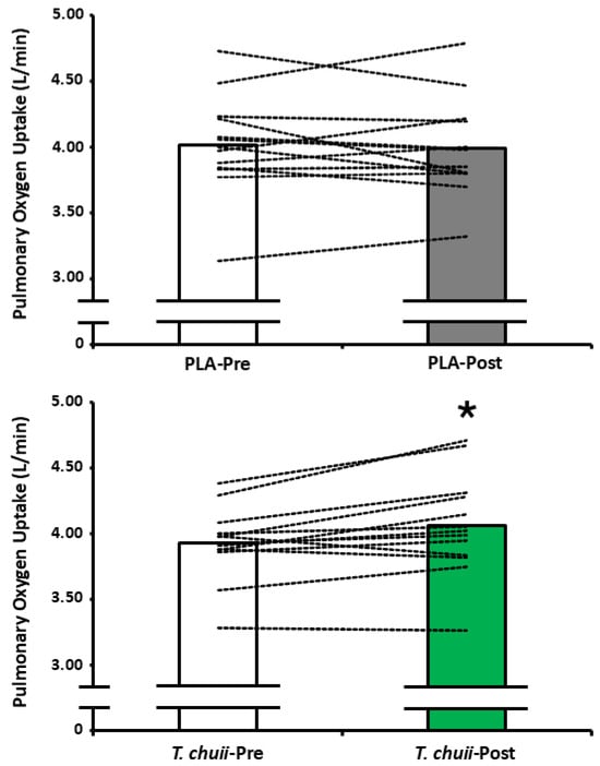 Pulmonary oxygen update during the final 30 s of a high-intensity cycling test continued to exhaustion. Bars represent group mean data whilst dashed lines represent individual participant data. T. chuii, 25 mg/day T. chuii with hemicellulose crystalline as an excipient; placebo (PLA), PLA containing hemicellulose crystalline only; pre, pre-supplementation baseline; post, post-supplementation for 2 weeks. * denotes significant different (p < 0.05) from T. chuii-Pre.