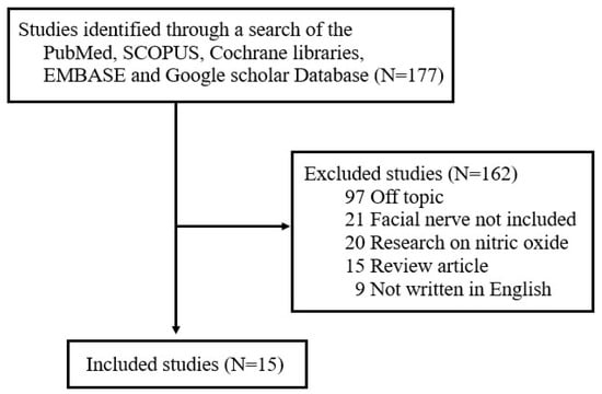 Although various studies have examined the role of FRs and ROS in different diseases, there has not been a comprehensive review of the literature on the production and role of FRs and ROS after facial nerve injury. To address this unmet need, one author (J.L) searched for studies published between January 1997 and September 2024 in five electronic databases—Cochrane Libraries, EMBASE, Google Scholar, PubMed, and SCOPUS—using the search terms ‘free radicals’, ‘reactive oxygen species’, and ‘facial nerve’. The literature search focused on studies published in English and included (1) prospective or retrospective studies on NO in facial nerves and (2) studies involving either humans or animals. The following exclusion criteria were applied: (1) unpublished data, (2) review articles, (3) gray literature, (4) case reports, (5) duplicates, and (6) previously published literature review studies by the author on the expression of nitric oxide (NO) in facial nerves [16]. Of the original 157 studies returned by search terms, 15 were ultimately selected for review (Figure 1). All selected studies focused on analyzing changes in FR and ROS levels in the context of facial nerve injury. The papers were categorized based on whether FRs and ROS played a positive or negative role in the pathogenesis of facial nerve degeneration and regeneration.
