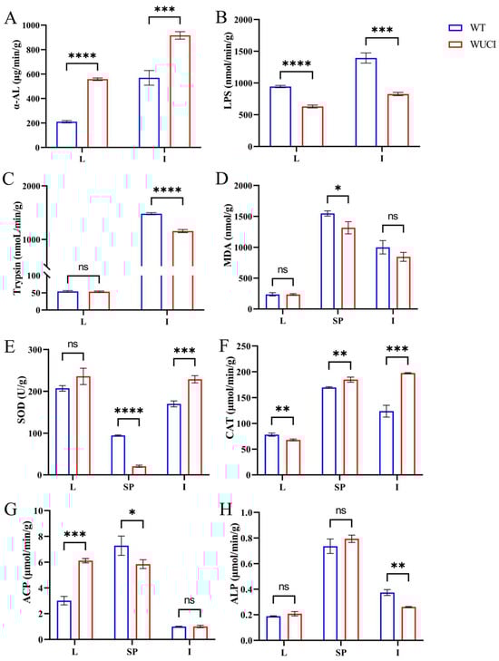 The results of digestive, antioxidant capacity, and immune functions in the liver (L), intestines (I), and spleen (SP) of WT and WUCI. (A) The activities of α-AL. (B) The activities of LPS. (C) The activities of Trypsin. (D) The contents of MDA. (E) The activities of SOD. (F) The activities of CAT. (G) The activities of ACP. (H) The activities of ALP. Data are presented as mean ± SD (n = 3). WT: the wild-type crucian carp; WUCI: the new strain without intermuscular bones; *: p < 0.05; **: p < 0.01; ***: p < 0.001; ****: p < 0.0001; ns: no significance.