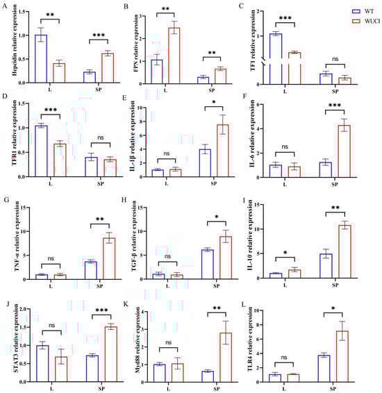 The relative mRNA expression of iron metabolism and immune-related genes in the liver (L) and spleen (SP) of WT and WUCI. (A) Hepcidin. (B) FPN. (C) TF. (D) TFR1. (E) IL-1β. (F) IL-6. (G) TNF-α. (H) TGF-β. (I) IL-10. (J) STAT3. (K) Myd88. (L) TLR4. Data are presented as mean ± SD (n = 3). WT: the wild-type crucian carp; WUCI: the new strain without intermuscular bones; *: p < 0.05; **: p < 0.01; ***: p < 0.001; ns: no significance.