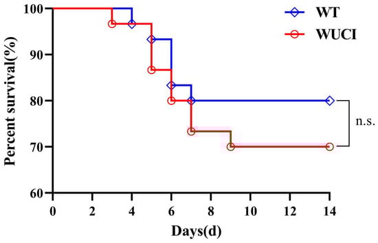 The results of survival of WUCI and WT after challenge with A. hydrophila which lasted for 14 days. n.s.: no significance. n = 30.