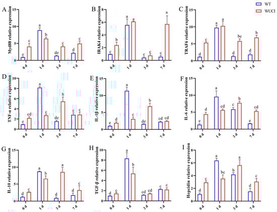The relative mRNA expression of immune-related genes in the spleen of WT and WUCI post A. hydrophila injection. (A) Myd88. (B) IRAK4. (C) TRAF6. (D) TNF-α. (E) IL-1β. (F) IL-6. (G) IL-10. (H) TGF-β. (I) Hepcidin. Data are presented as mean ± SD (n = 3). WT: the wild-type crucian carp; WUCI: the new strain without intermuscular bones; different letters indicate a significant difference (p < 0.05).
