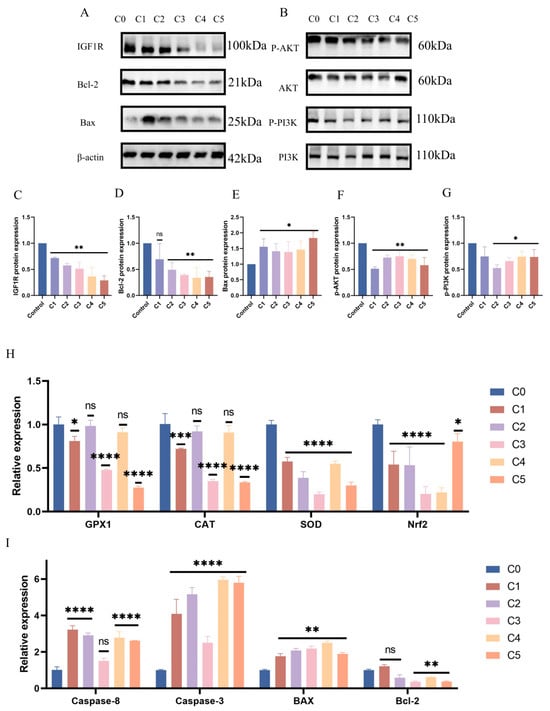 To further investigate the role of IGF1R in the oxidative stress response, siRNA knockdown was performed at various IGF1R sites, with si-IGF1R-2009 demonstrating the most significant effect (p < 0.0001) (Figure 7B). The knockdown of IGF1R resulted in a marked increase in MDA (p < 0.01) levels and a notable reduction in SOD (p < 0.05), GPx (p < 0.01), and total antioxidant capacity (p < 0.01) (Figure 7G). Furthermore, IGF1R knockdown inhibited the PI3K/AKT pathway (p < 0.05) (Figure 7A,F,G). Quantitative PCR analyses revealed the downregulation of the antioxidant marker genes GPx1 (p < 0.05), CAT (p < 0.0001), SOD (p < 0.0001), and Nrf2 (p < 0.0001), reflecting diminished cellular antioxidant capacity (Figure 7H). Western blot results indicate an upregulation of pro-apoptotic proteins and a downregulation of anti-apoptotic proteins (Figure 7A,D,E). Concurrently, qPCR analysis showed an increased expression of the pro-apoptotic genes Bax (p < 0.0001), Caspase-8 (p < 0.05), and Caspase-3 (p < 0.0001), and a decreased expression of the anti-apoptotic gene Bcl-2 (p < 0.0001) (Figure 7I). These findings suggest that IGF1R plays a critical negative regulatory role in the oxidative stress response, where its downregulation exacerbates oxidative stress and apoptotic responses.