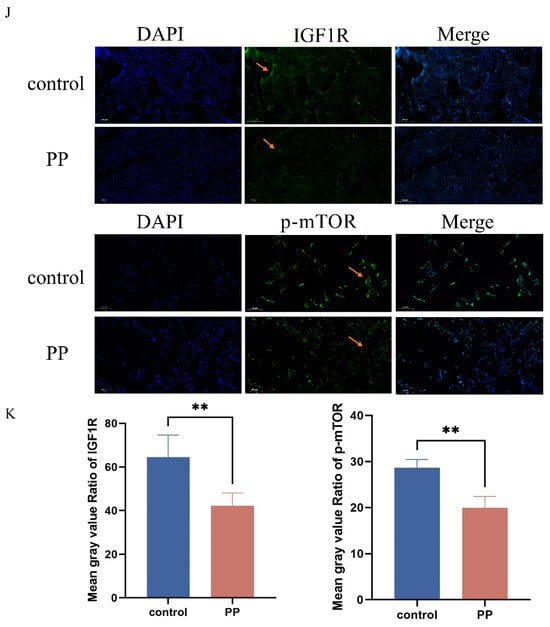 BEECs were seeded onto sterile glass coverslips placed in 24-well plates at a density of 30,000 cells per coverslip. The coverslips were sterilized by autoclaving or by soaking in 70% ethanol and then rinsed with sterile PBS. Following stimulation with KMnO4 (C1: 0.01%, C2: 0.025%, C3: 0.05%, C4: 0.1%, C5: 0.5%) for 12 h, cells were washed twice with PBS and fixed with 4% paraformaldehyde for 20 min. Cells were then permeabilized with Triton for 15 min, washed three times, and blocked with blocking buffer at room temperature for three hours. Primary antibodies (anti- IGF1R, 1:200; anti-phosphorylated m-TOR, 1:400) were added and incubated overnight at 4 °C in the dark. After three additional washes with PBS, secondary antibodies (FITC Goat Anti-Rabbit IgG, Lot:AS011, 1:200; or FITC Goat Anti-Mouse IgG, Lot:AS001, 1:200; Abclonal, China) were added and incubated at room temperature for three hours. Nuclei were stained with DAPI at room temperature for 15 min. Cell coverslips were rewashed three times and visualized using a fluorescence microscope (CKX41, Olympus, Tokyo, Japan).