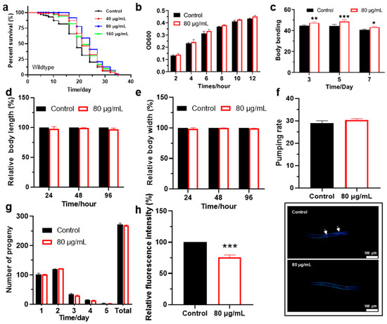 Locomotor ability is an important indicator of the health status of worms, reflecting the normal function of their nervous system and muscles [41]. The locomotor ability of worms can be measured by indicators such as body bending frequency. Worms were treated with 80 μg/mL berberine for 3, 5, and 7 days, respectively, and then placed in droplets of M9 buffer to observe and record the number of body bends within 30 s at different treatment durations (Figure 2c). The results showed that the locomotor ability of worms treated with berberine was significantly enhanced, with the most significant effect observed after 5 days of treatment. Therefore, 5 days was chosen as the optimal treatment duration for subsequent experiments.