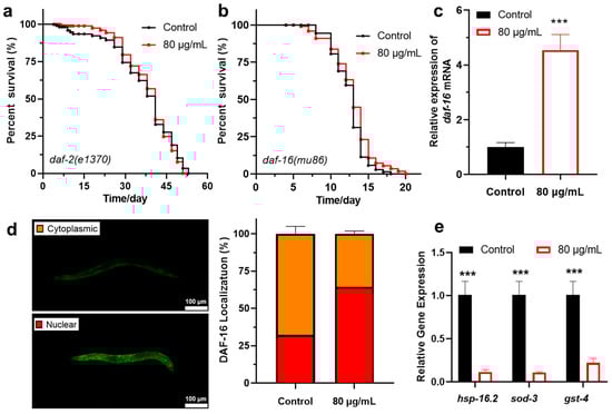(a) The effect of berberine on the lifespan of C. elegans daf-2(e1370) mutant strain. (n > 70). (b) The effect of berberine on the lifespan of C. elegans daf-16(maDf50) mutant strain. (n > 70). (c) The effect of berberine on the expression level of daf-16 mRNA in wild-type C. elegans. (d) Berberine promotes the nuclear translocation of the DAF-16 transcription factor. Right: DAF-16::GFP aggregates in the nucleus, showing green fluorescent spots. (n = 100). (e) The effect of berberine on the expression levels of downstream genes in daf-16(maDf50) mutant C. elegans. *** p < 0.001, two-tailed Student’s t test.